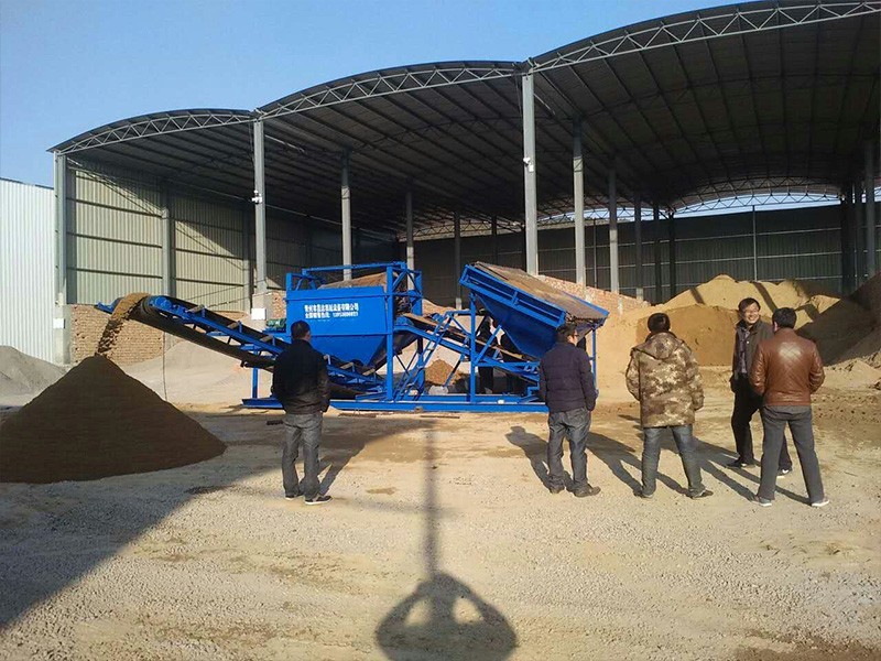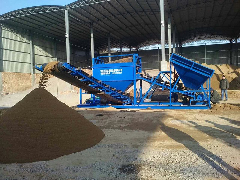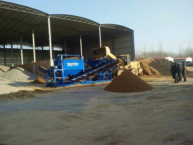 整個設(shè)備由原料儲料斗、原料供料皮帶機(jī)、平置篩網(wǎng)、成品砂堆料皮帶、棄石出料槽等組成,設(shè)備通電運(yùn)轉(zhuǎn)后由裝載機(jī)將原料裝入大容量儲料斗,原料經(jīng)由供料皮帶投入到平置篩筒,旋轉(zhuǎn)的篩筒帶動原料在筒內(nèi)葉片的推擠、翻滾下形成原料在篩網(wǎng)面滑滾的人工篩砂效果,篩出的成品砂通過集料斗落在成品砂皮帶上,同時被皮帶提升落下呈成品料堆、或直接落入儲料斗,整個過程連續(xù)且物料分級清楚。