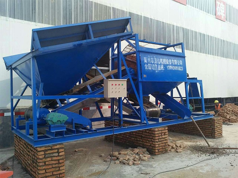整個(gè)設(shè)備由原料儲(chǔ)料斗、原料供料皮帶機(jī)、平置篩網(wǎng)、成品砂堆料皮帶、棄石出料槽等組成,設(shè)備通電運(yùn)轉(zhuǎn)后由裝載機(jī)將原料裝入大容量?jī)?chǔ)料斗,原料經(jīng)由供料皮帶投入到平置篩筒,旋轉(zhuǎn)的篩筒帶動(dòng)原料在筒內(nèi)葉片的推擠、翻滾下形成原料在篩網(wǎng)面滑滾的人工篩砂效果,篩出的成品砂通過(guò)集料斗落在成品砂皮帶上,同時(shí)被皮帶提升落下呈成品料堆、或直接落入儲(chǔ)料斗,整個(gè)過(guò)程連續(xù)且物料分級(jí)清楚。